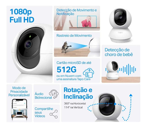 A camera TP-Link Tapo TC70 é a solucao ideal para quem busca seguranca e tranquilidade em ambientes internos. Com resolucao Full HD 1080p, voce poderá monitorar cada detalhe com clareza. Seu design elegante na cor branca se adapta facilmente a qualquer decoracao, tornando-a uma adicao discreta e eficaz a sua casa. Equipado com tecnologia de deteccao de movimento, o TC70 oferece um campo de visao panoramico de 360° horizontal e 114° vertical, permitindo que voce acompanhe o que acontece em todos os cantos do ambiente. A funcao de rastreamento de movimento garante que a camera siga automaticamente qualquer atividade suspeita, proporcionando uma vigilancia contínua e eficaz. A camera também conta com áudio bidirecional, permitindo que voce se comunique com quem está no local, seja para acalmar um bebe ou interagir com visitantes. A deteccao de choro de bebe e de pessoas adiciona uma camada extra de seguranca, alertando voce sobre eventos importantes em tempo real. Com conectividade Wi-Fi, voce pode acessar as imagens da camera diretamente pelo seu smartphone, seja iOS ou Android. A visao noturna garante que voce tenha monitoramento mesmo em condicoes de pouca luz, assegurando que sua casa esteja sempre protegida, dia e noite.
